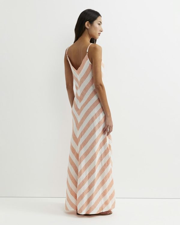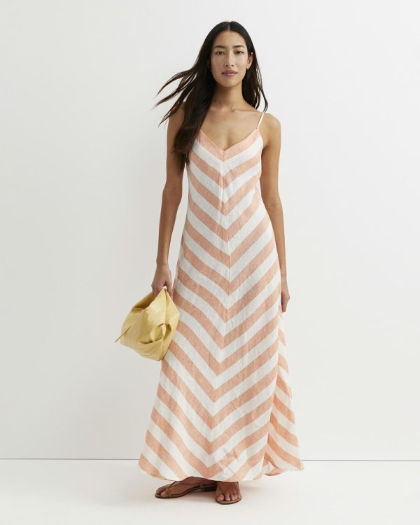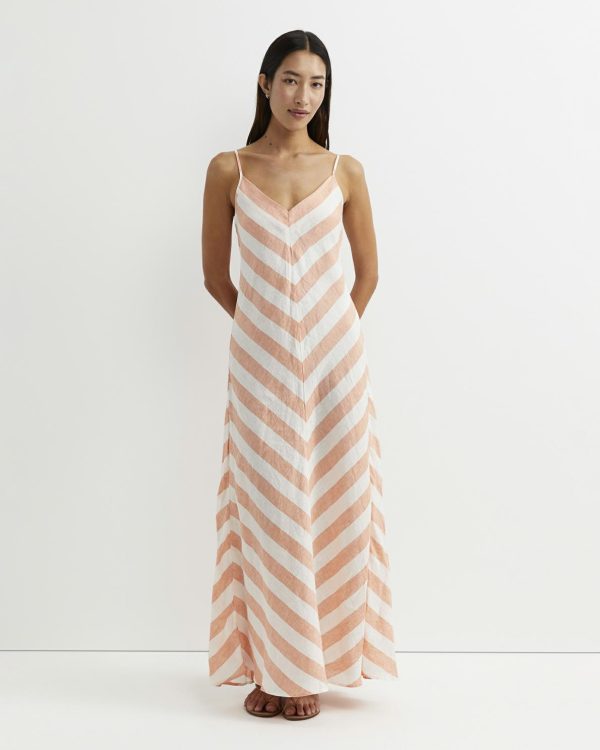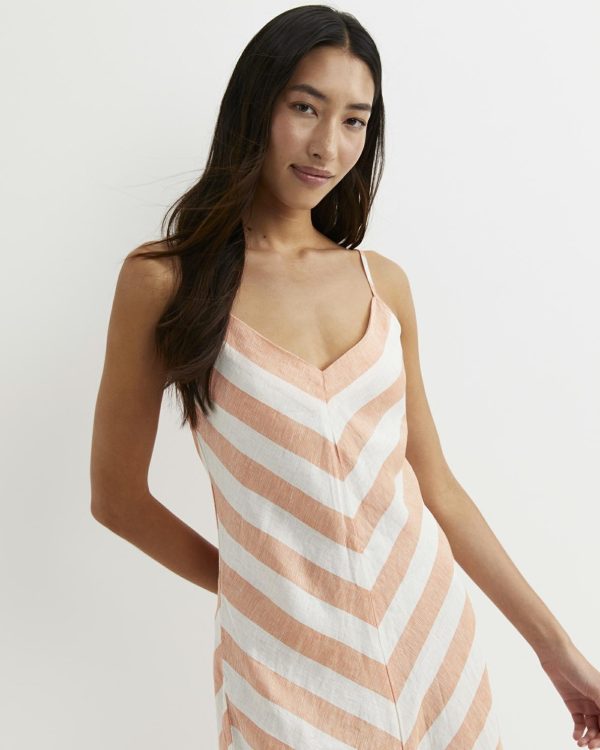 The Callie Stripe Slip Dress has been made from 100% breathable linen. This midi length dress has a slip-style silhouette, a sleeveless cut and an Australian design. Wear it with a shoulder bag for a relaxed weekend vibe.