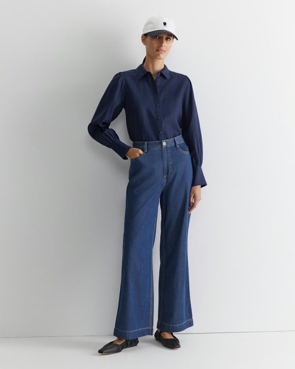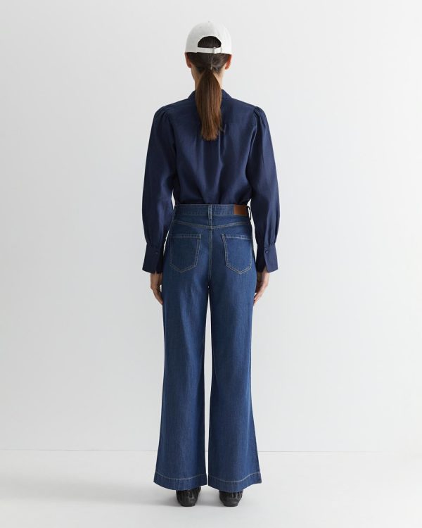 Refresh your range of denim in the Tuva Denim Wide Leg Pant. Made with chambray fabric, these high rise pants have a wide leg design, a full-length hemline, a centre front fly with a zip and button closure, these pants come complete with five pocket styling. Pair them with a button-down shirt for a balanced touch.